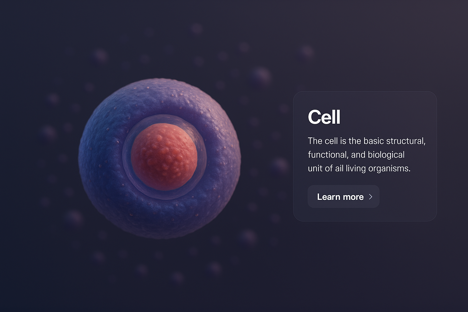 /Collection: /by davooda/Type: PNG/A realistic 3D depiction of a cell, featuring a gradient dark background. The cell is centered with a red nucleus and surrounded by smaller visual elements, complemented by a text block and action button.