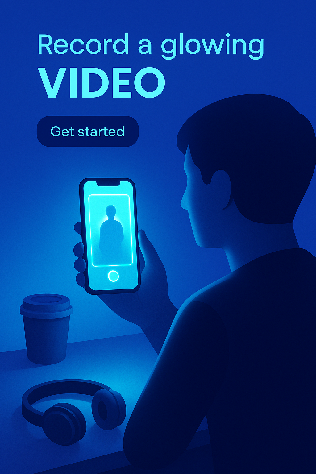 A person holding a phone recording a glowing video. The scene features a blue background, with a glowing figure on the phone screen, creating a cool atmosphere.