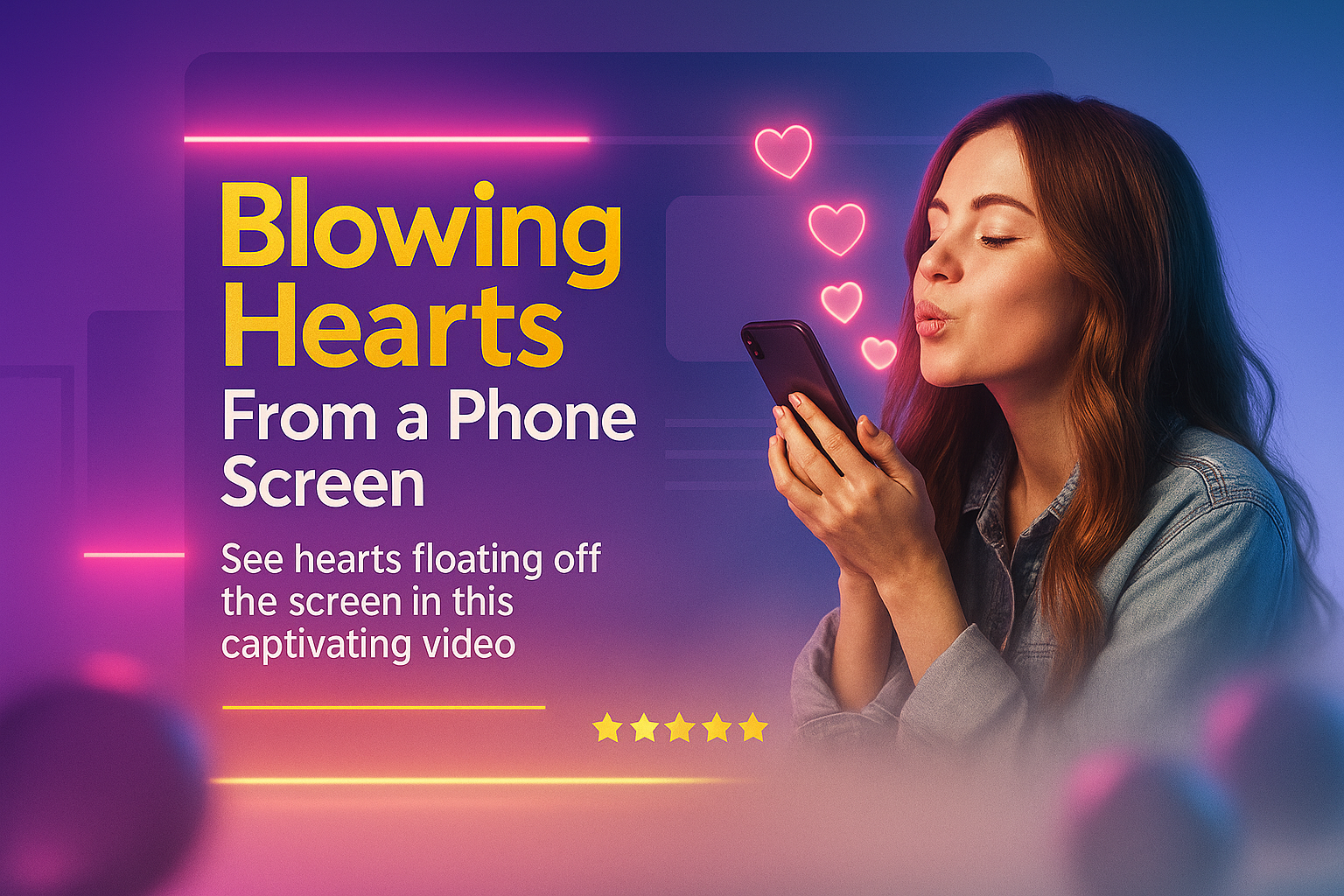 Vibrant promotional image showcasing a woman interacting with a phone screen, with hearts floating away. Ideal for social media marketing or video promotions.