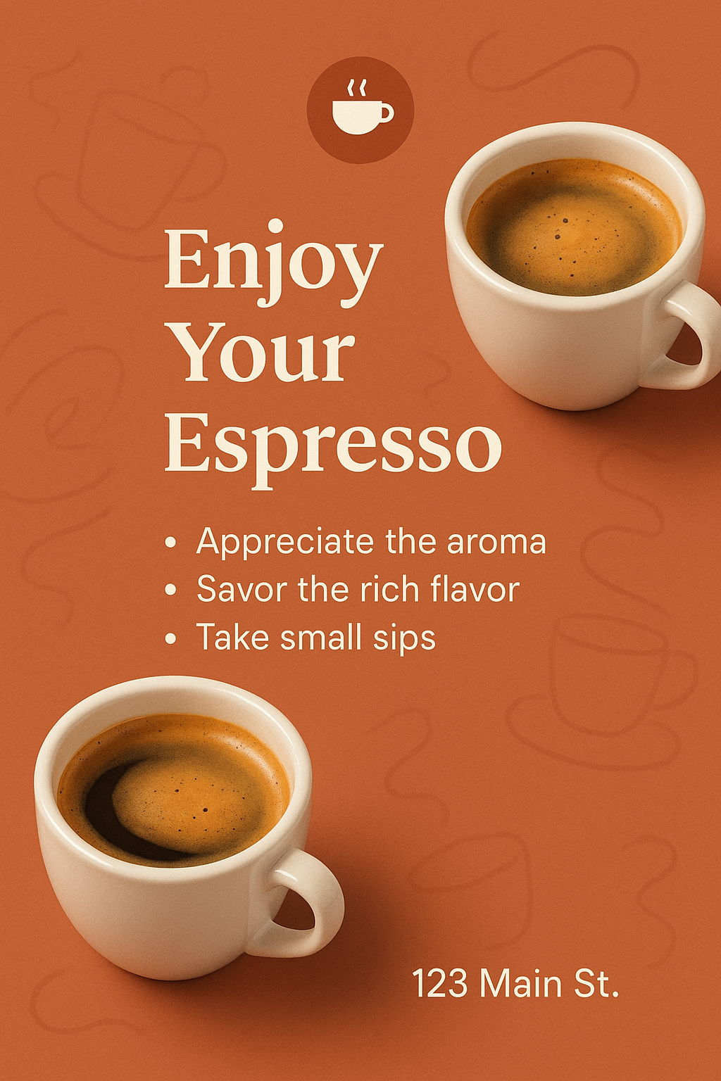 Engaging promotional graphic for espresso lovers featuring visually appealing cups of espresso, designed to entice coffee enthusiasts with tips on savoring the drink, suitable for cafes or coffee shops.