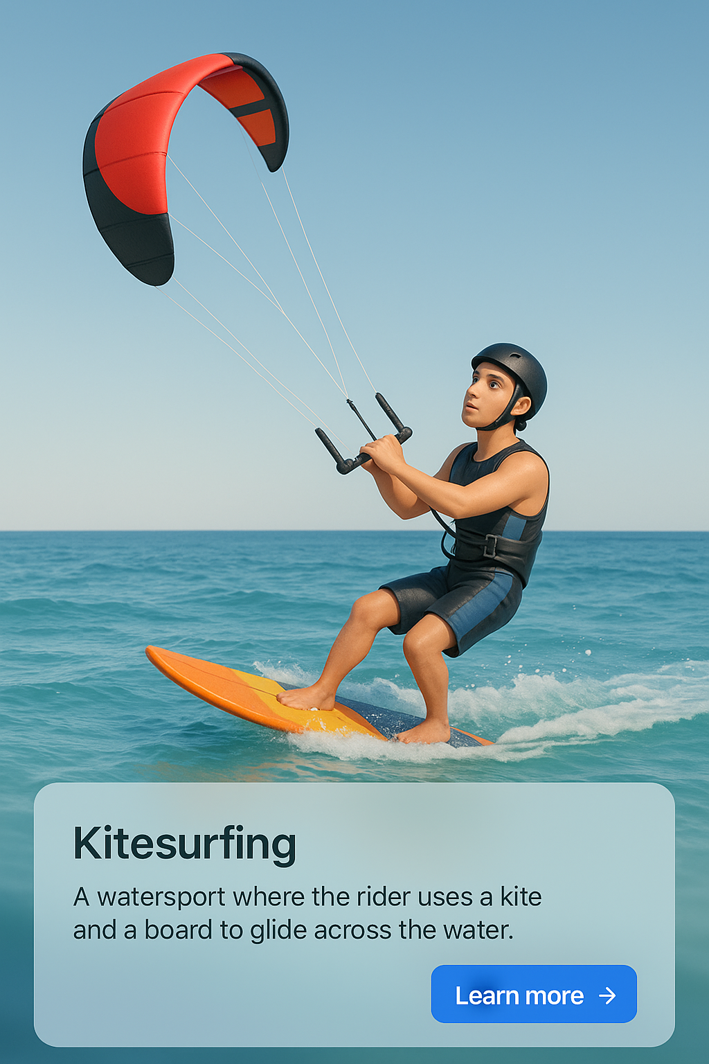 /Collection: /by davooda/Type: PNG/A detailed 3D illustration of kitesurfing, featuring a rider skillfully maneuvering on water with vibrant colors and engaging text elements for user interaction.
