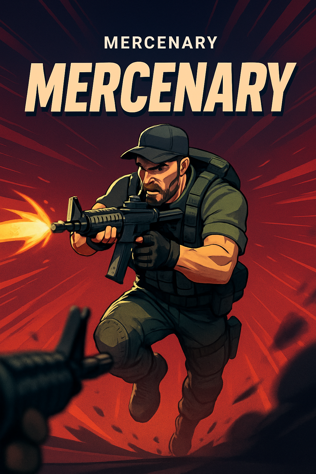 An action-packed illustration of a mercenary in motion, wielding a weapon against a vibrant background of radiating lines. The title 'MERCENARY' is prominently displayed in bold font.