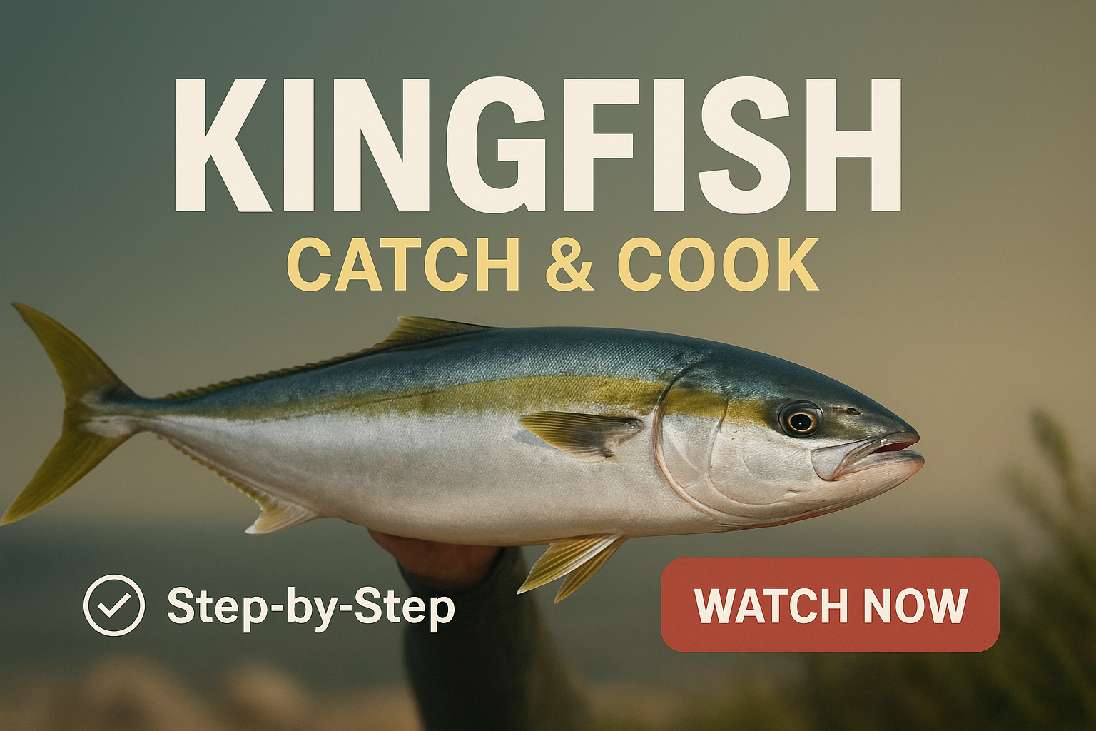 Dynamic thumbnail for a fishing tutorial showcasing a kingfish. The design is visually appealing and aimed at fishing enthusiasts, encouraging viewers to watch the step-by-step guide.