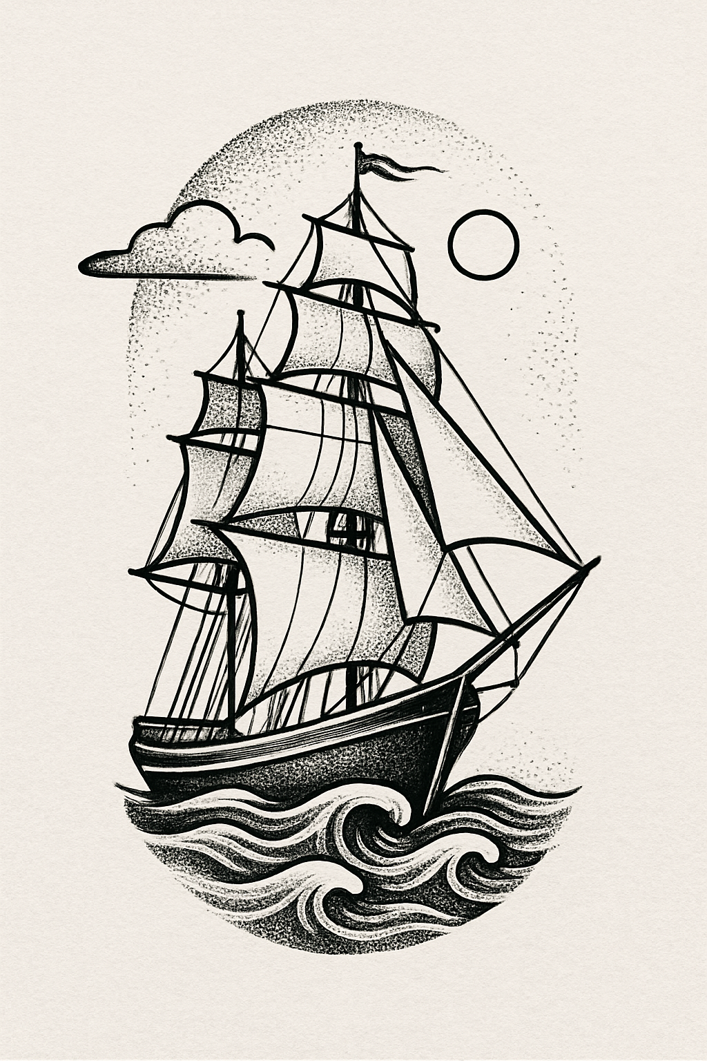 /Collection: /by davooda/Type: PNG/This image features a detailed illustration of a vintage ship navigating waves, complemented by a sun and cloud. Its artistic style is suited for nautical themes.