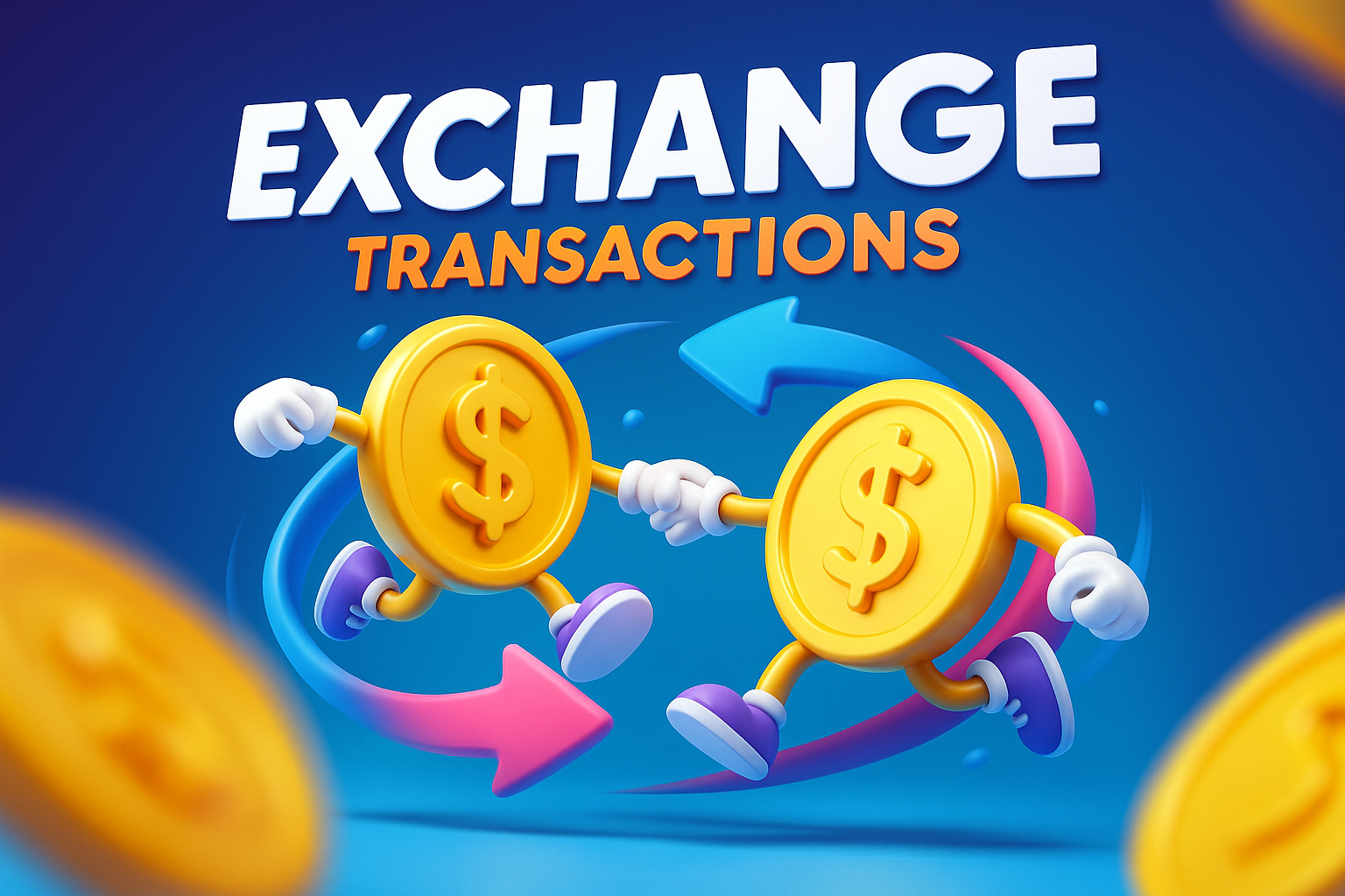 A vibrant 3D scene depicting animated coins symbolizing exchange transactions, with a smooth gradient background enhancing the dynamic feel.