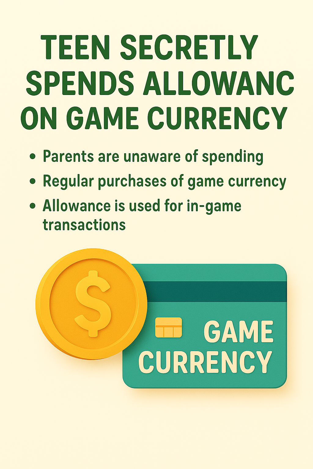Informative infographic illustrating teen spending habits on game currency, highlighting parental unawareness and transaction details, suitable for educational and parenting discussions.