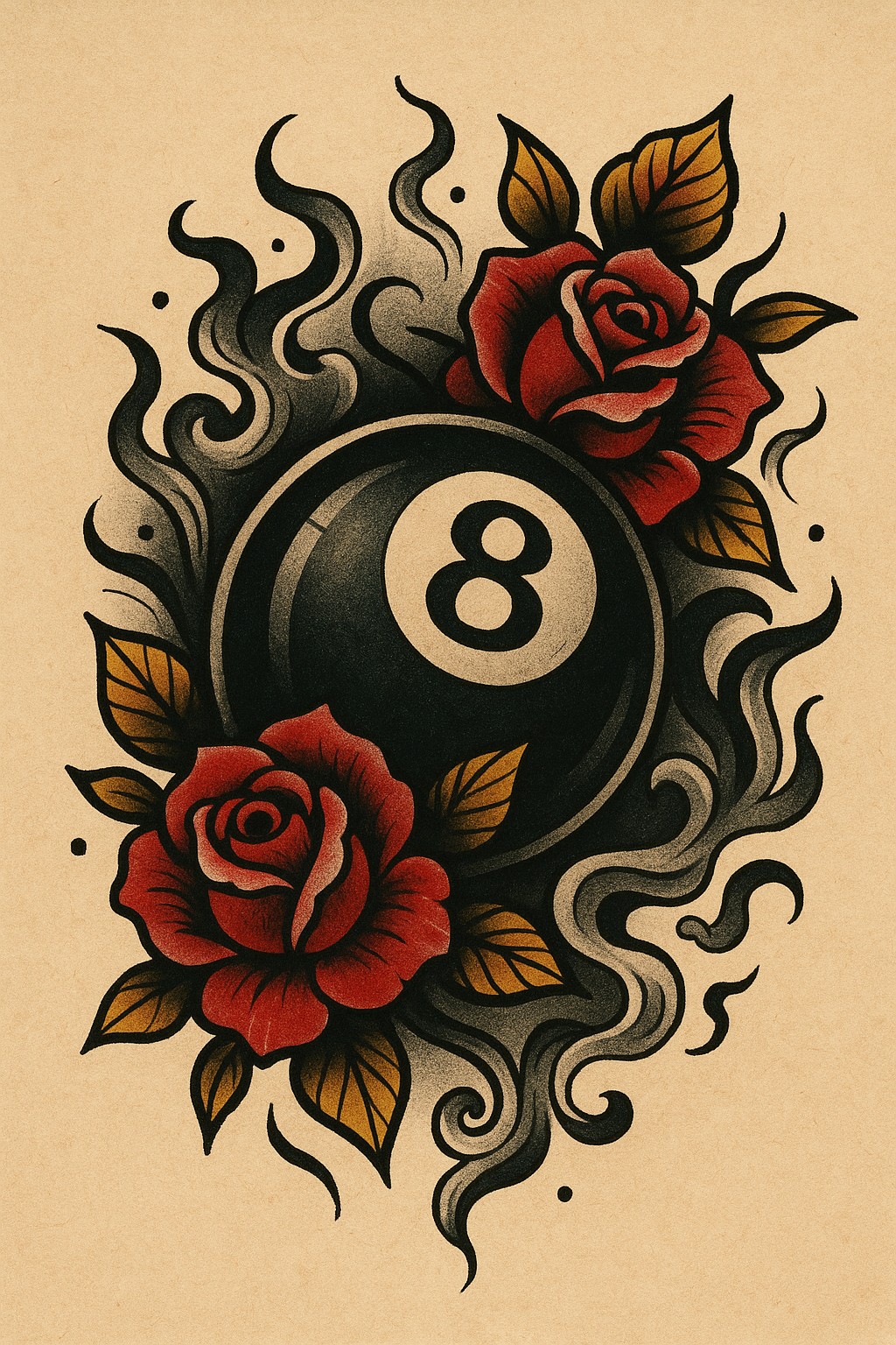 This image features a classic tattoo style illustration of an 8-ball encircled by red roses and swirling smoke. Ideal for tattoo art and design inspiration.