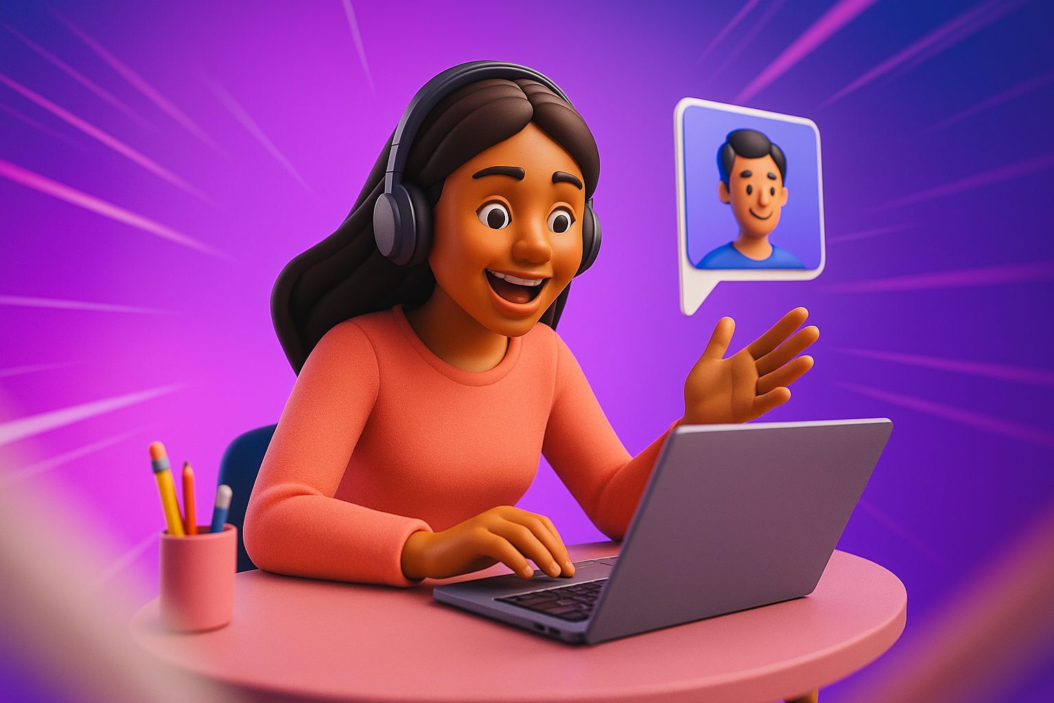 /Collection: /by davooda/Type: PNG/A young woman with headphones eagerly participates in a virtual meeting from her home office. She is using her laptop, surrounded by vibrant dynamic elements, illustrating a modern e-learning environment.