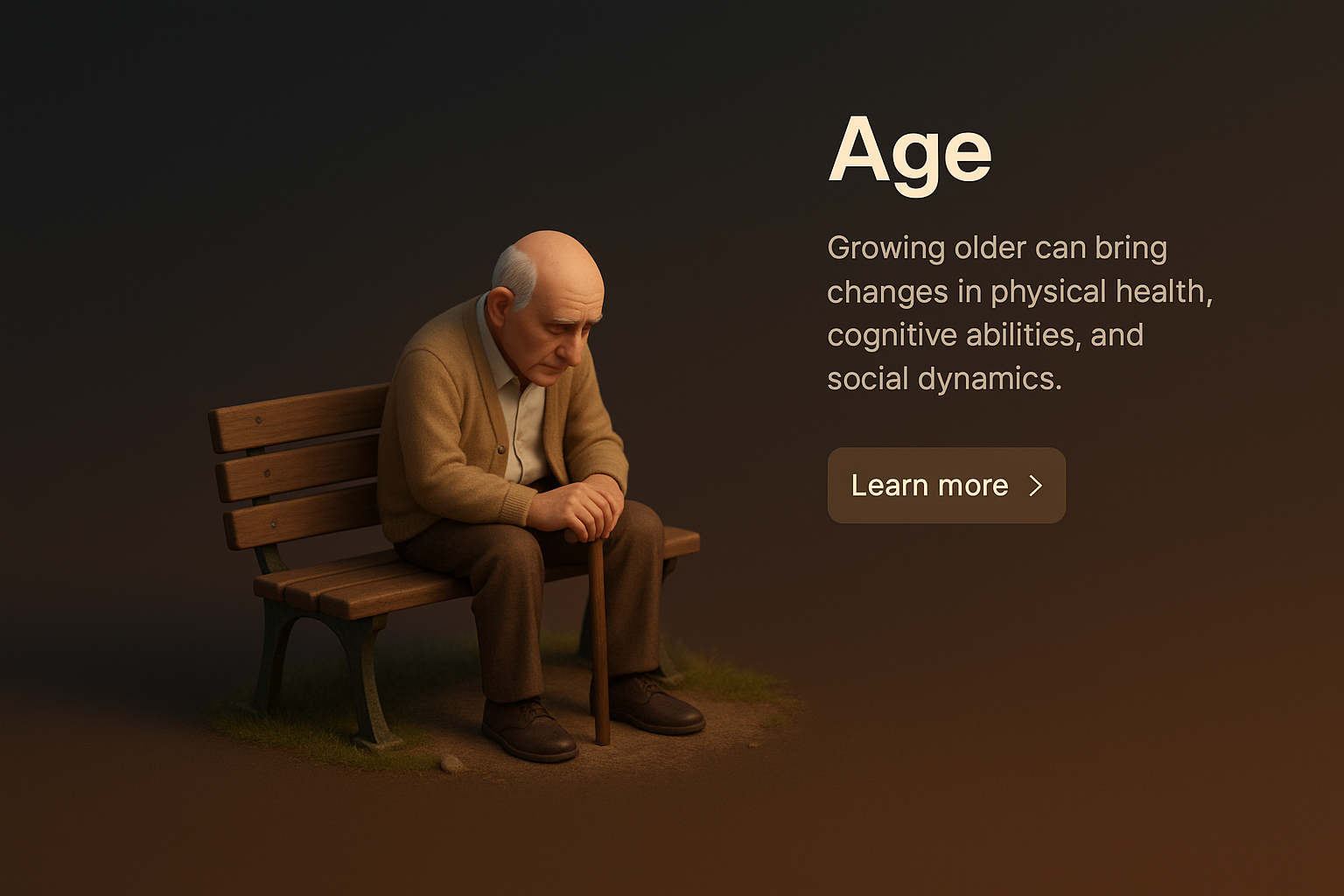 A detailed 3D scene depicting an older man sitting on a bench, reflecting on age. The background features a smooth gradient, enhancing the visual depth.