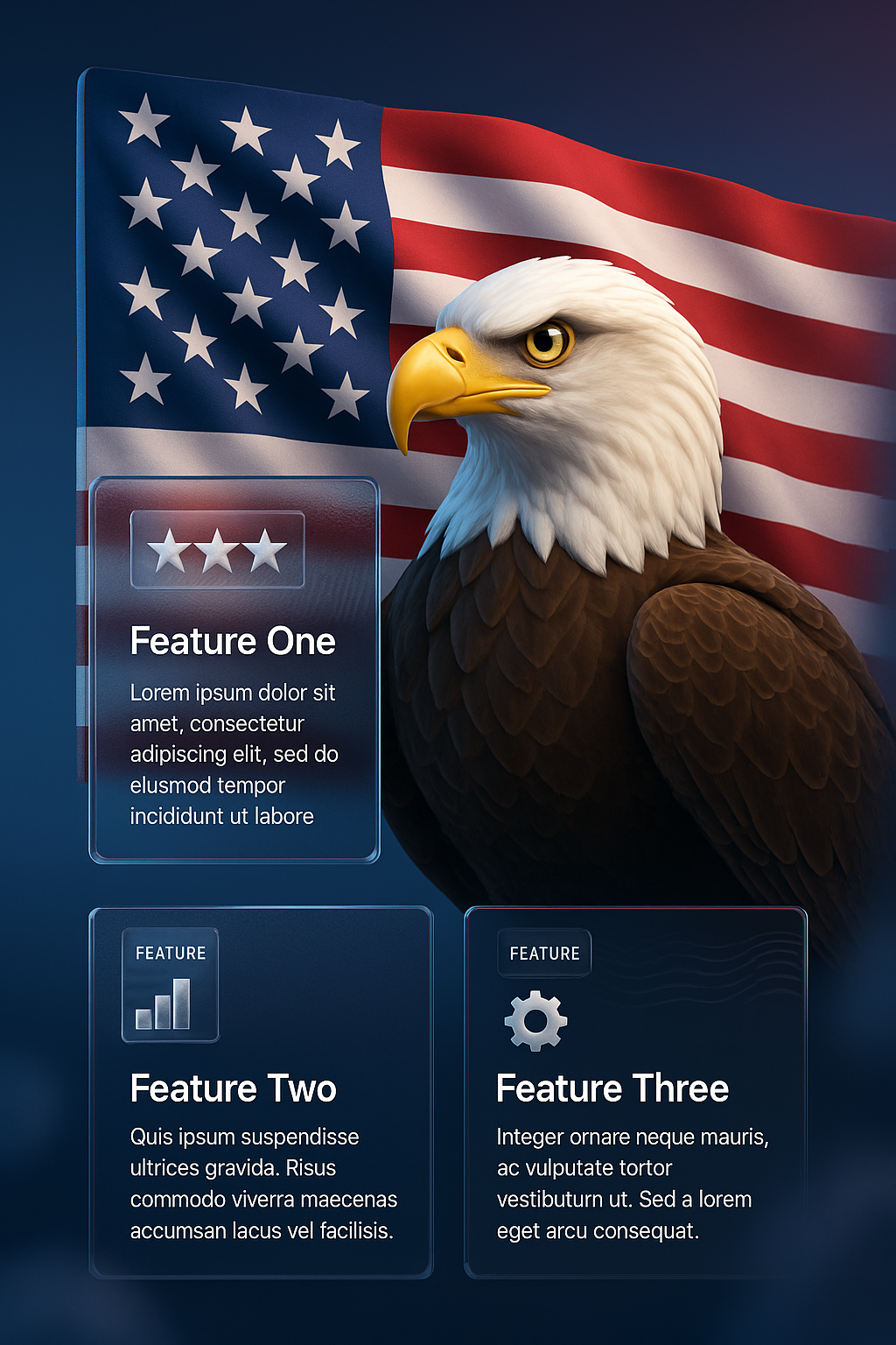 /Collection: /by davooda/Type: PNG/A dynamic 3D illustration featuring an eagle in front of the American flag, accompanied by three feature blocks with transparent designs, showcasing relevant information.