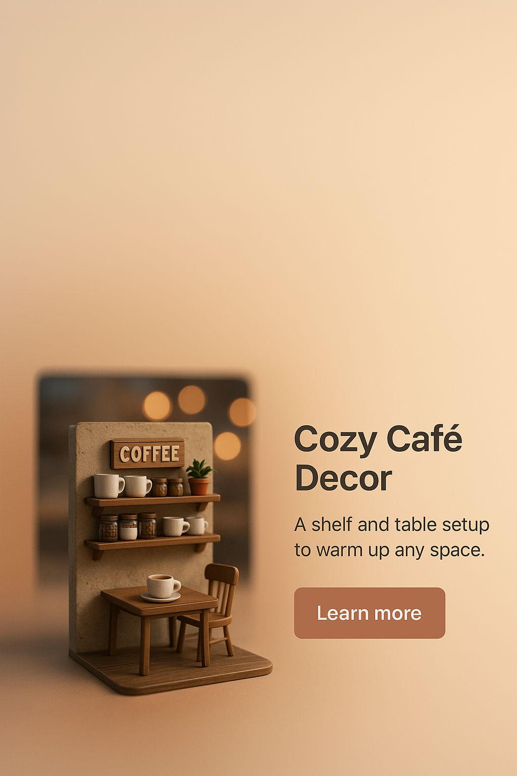 A beautifully crafted 3D scene depicting a cozy cafe setup with a shelf and table. The warm tones and bokeh background create an inviting ambiance.