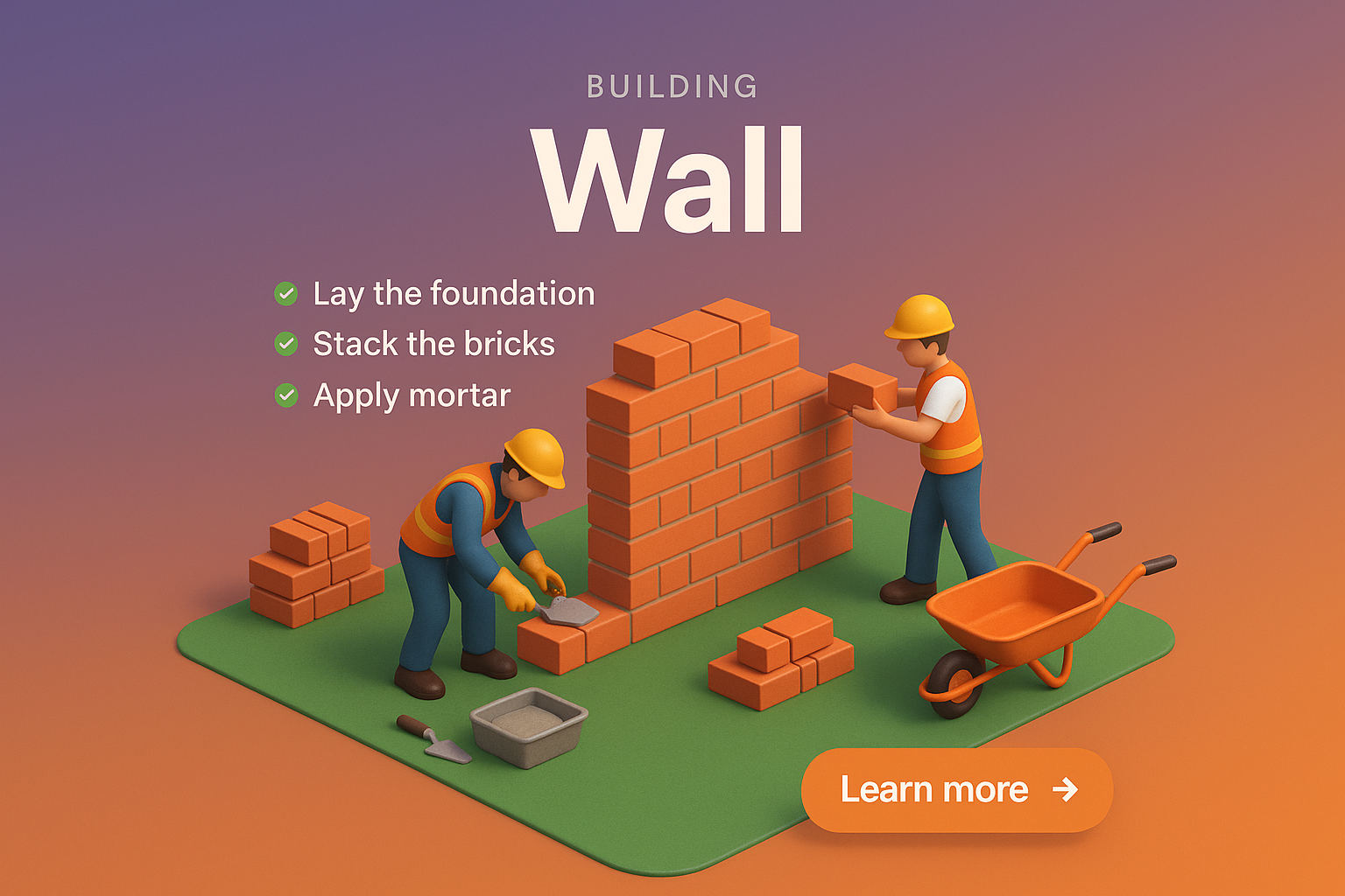 /Collection: /by davooda/Type: PNG/A detailed 3D illustration featuring small workers building a brick wall. The scene is zoomed out to show the entire setup, with vibrant colors and clear text elements.