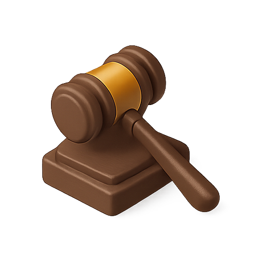 A 3D-rendered gavel icon symbolizing law and justice, designed with a modern aesthetic suitable for legal websites or applications.