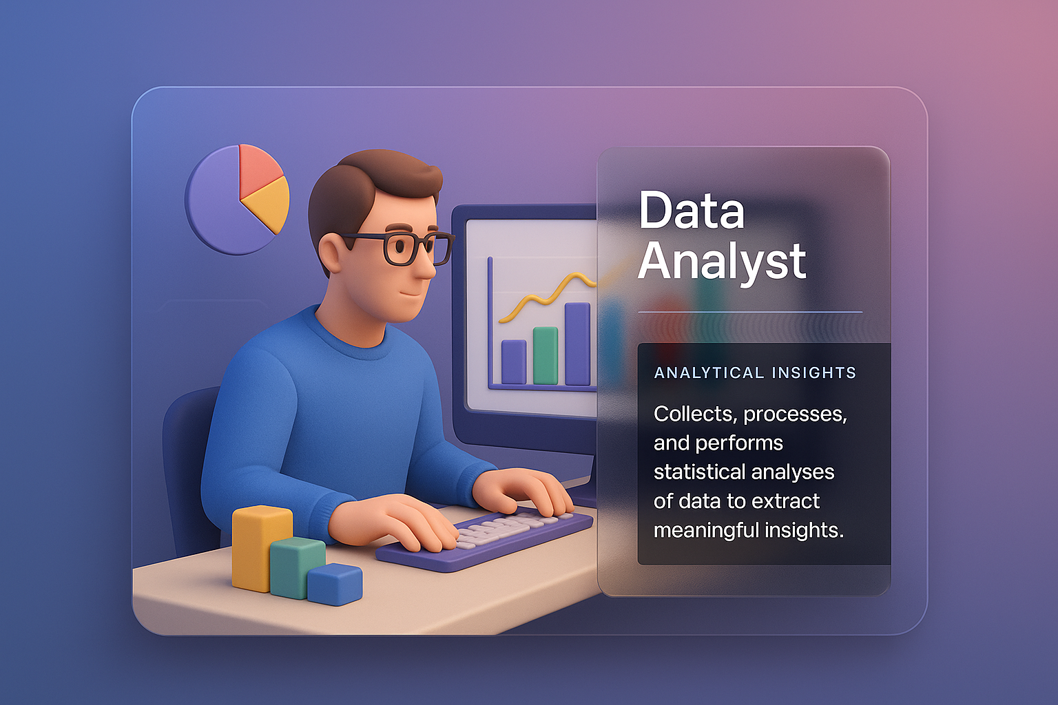 /Collection: /by davooda/Type: PNG/A 3D illustration of a data analyst working at a desk, featuring a computer screen with graphs and a pie chart. The design incorporates modern elements with a transparent panel displaying text about analytical insights.