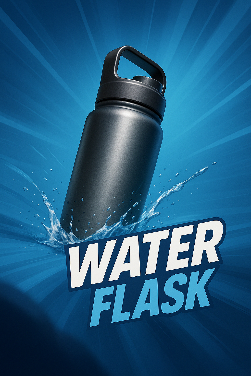 A sleek black water flask is prominently displayed against a dynamic blue background. Water splashes around it, enhancing the sense of motion and energy. Bold typography emphasizes the product.