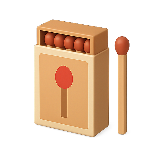 A minimalistic 3D representation of a matchbox and matchstick, designed with soft colors and smooth shapes. Ideal for product illustrations or creative projects related to fire safety or camping.