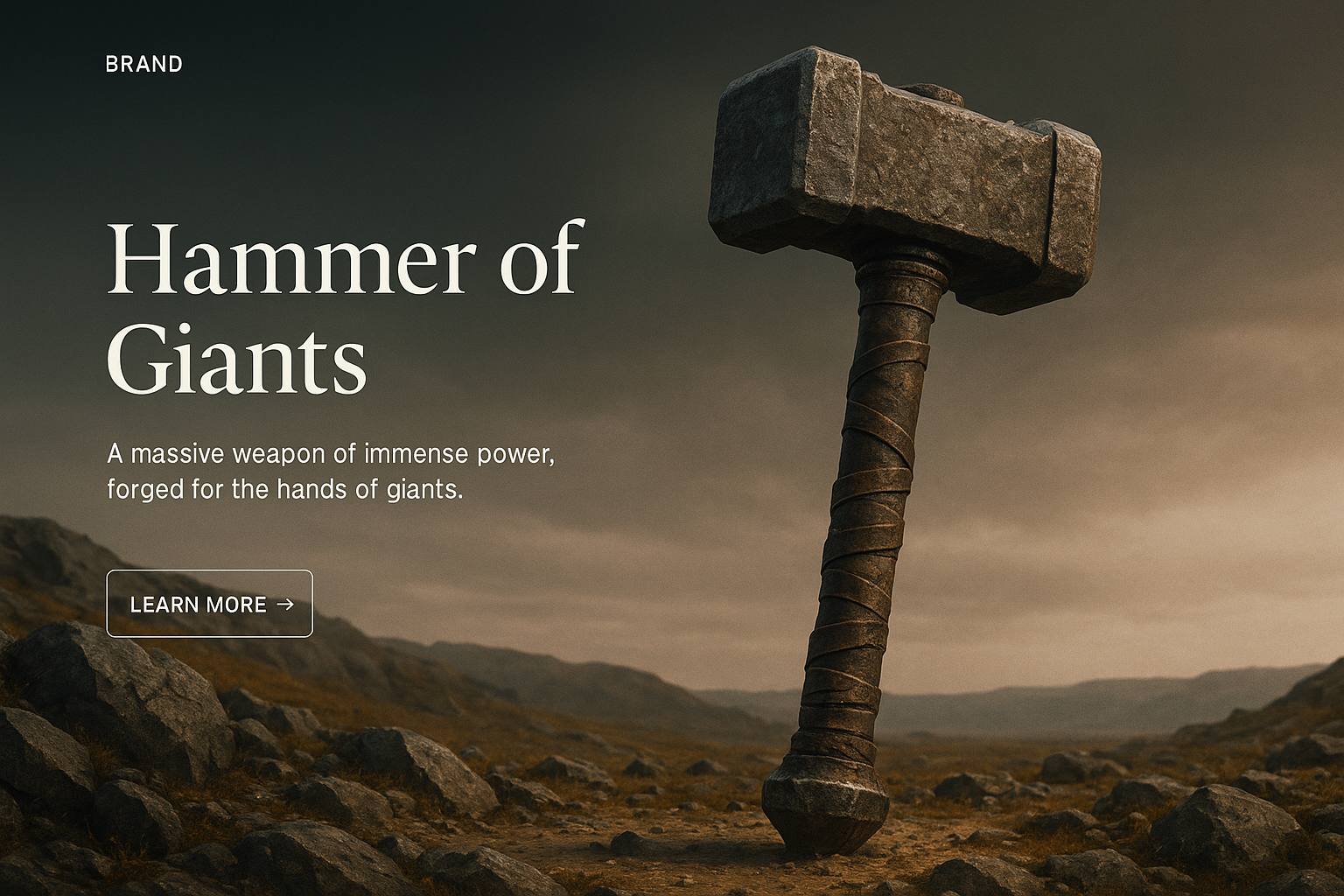 /Collection: /by davooda/Type: PNG/An imposing hammer rests on a rocky terrain, symbolizing immense power. The background features a gradient transitioning from dark to white, enhancing the hammer's prominence.