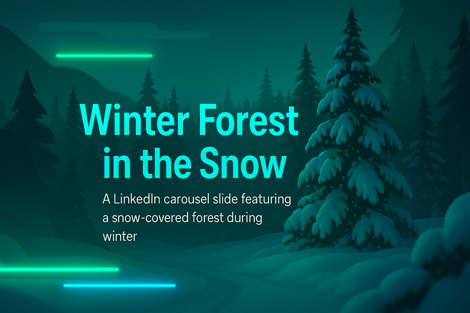 A visually appealing LinkedIn carousel slide showcasing a serene snow-covered forest landscape, perfect for winter-themed content and seasonal promotions.