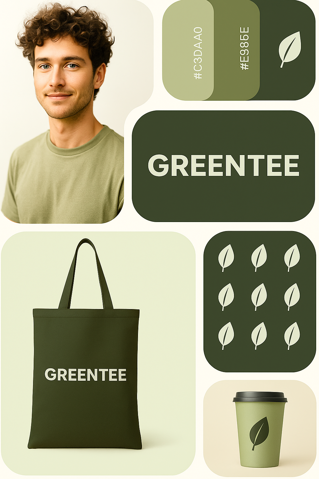 A fresh brand design showcasing eco-friendly merchandise. Features a model in a green shirt, tote bag, and coffee cup all branded with 'GREENTEE'.