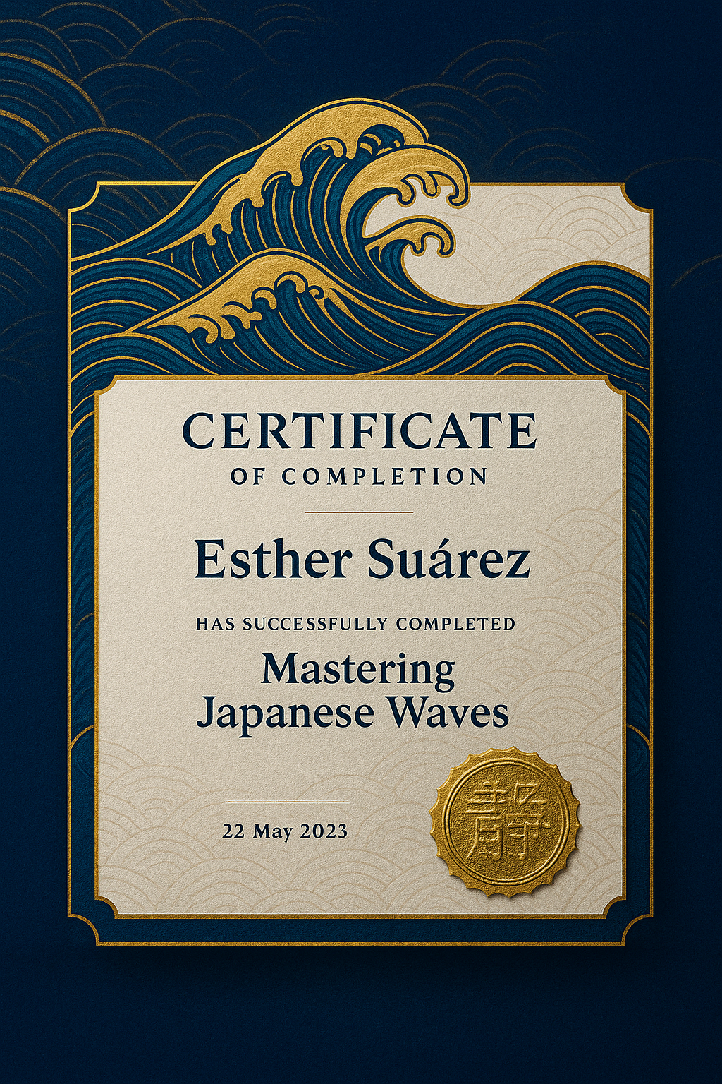 /Collection: /by davooda/Type: PNG/A sophisticated certificate featuring intricate wave patterns and a gold seal, designed to celebrate the completion of a course on Japanese Waves. Ideal for educational achievements.