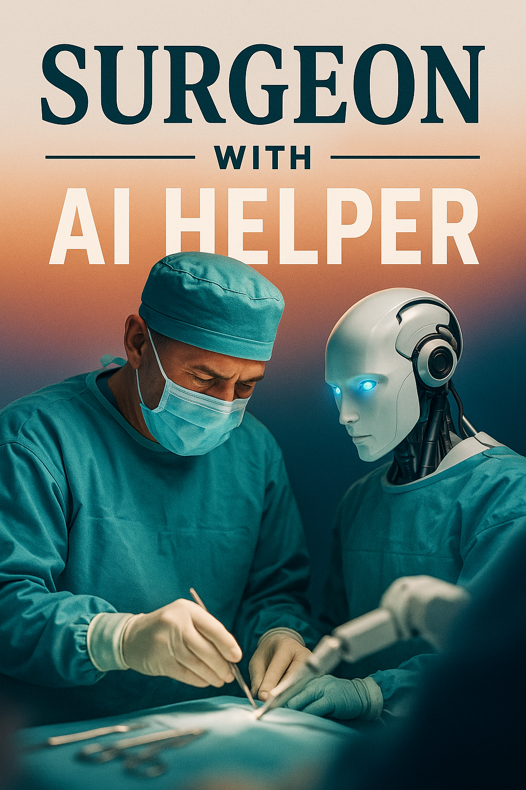 /Collection: /by davooda/Type: PNG/A surgeon in scrubs and a surgical mask works meticulously with a humanoid AI assistant. The background features a gradient that transitions from white to a vibrant hue, enhancing the focused atmosphere of the operating room.