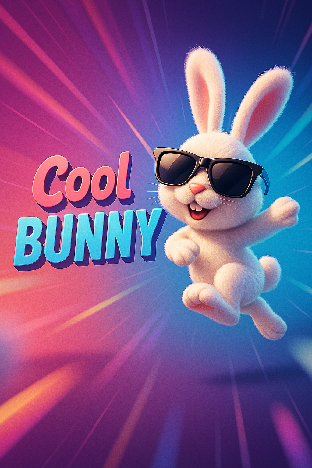 /Collection: /by davooda/Type: PNG/A lively 3D illustration of a cheerful bunny wearing sunglasses, set against a colorful gradient background with dynamic rays emanating from the center, creating an engaging visual experience.