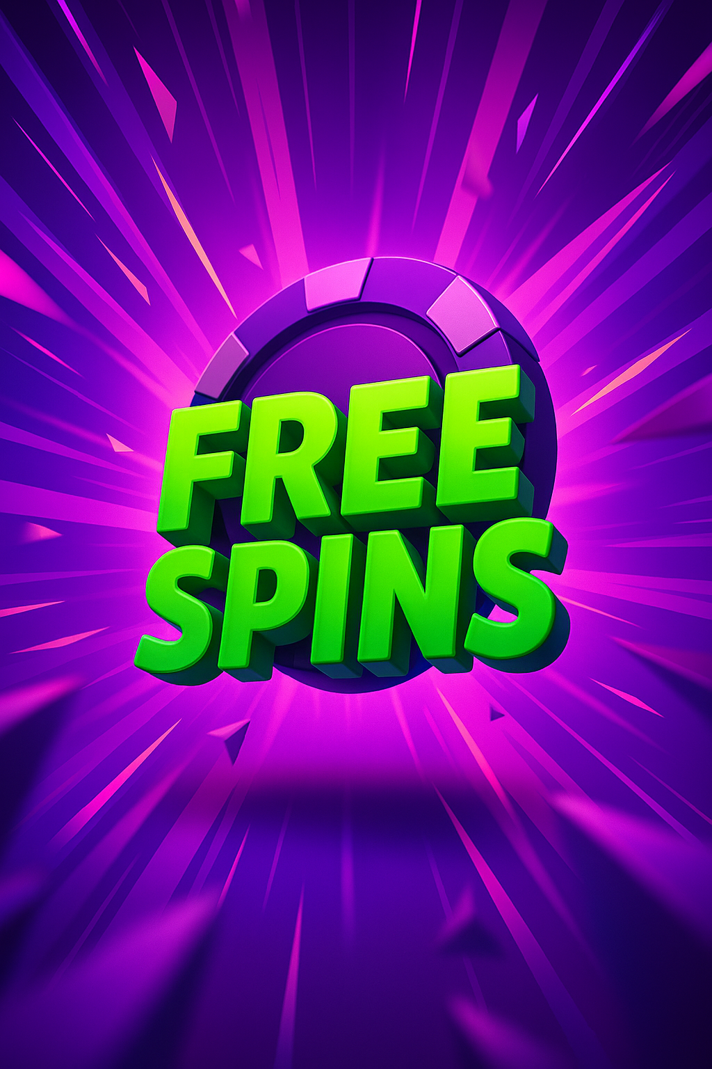 A visually striking depiction of a 'Free Spins' symbol, set against a dynamic purple background. The text is bold and green, radiating energy with sharp lines emanating from the center.