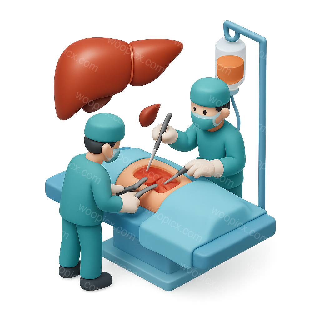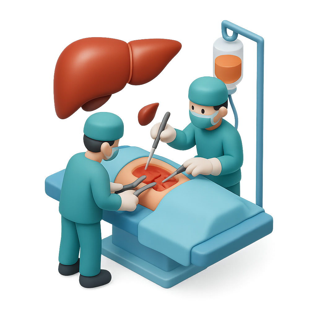 /Premium/Collection: /by davooda/Type: PNG/A 3D illustration depicting two surgeons performing surgery on a patient, with a liver shown above. The scene is colorful and cartoonish, highlighting a medical environment.