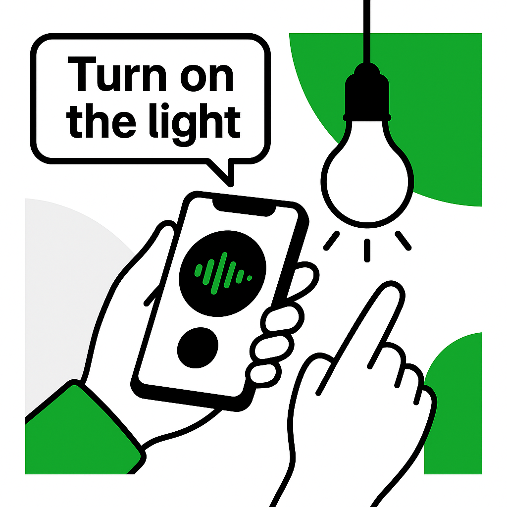 /Collection: /by davooda/Type: PNG/A modern graphic showing a hand holding a smartphone with a voice command feature, designed to illustrate smart home technology for lighting control. Ideal for tech-related content.