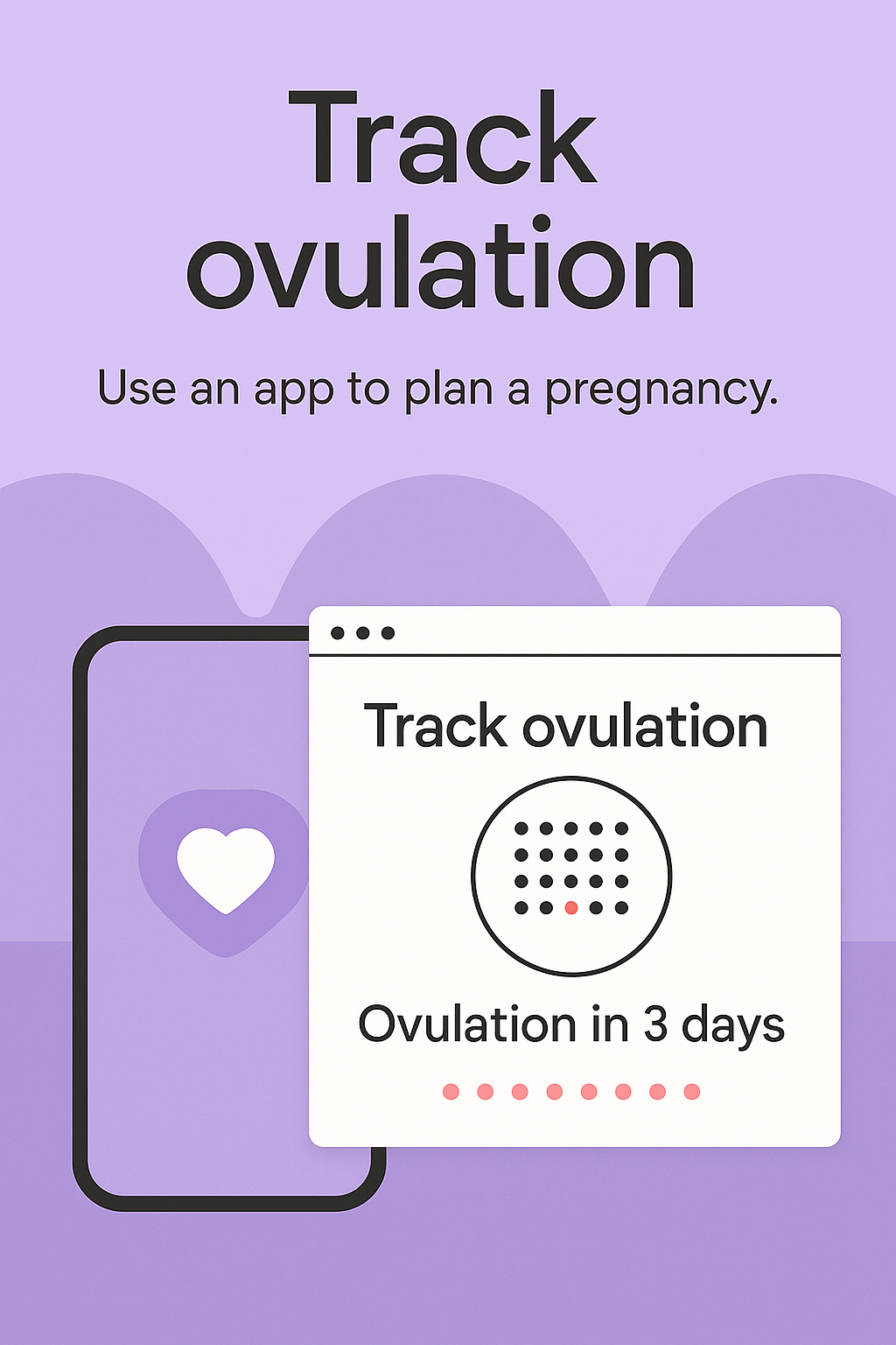 /Collection: /by davooda/Type: PNG/Modern graphic showcasing a mobile app interface focused on tracking ovulation for pregnancy planning. The design features a soft color palette and simple icons, appealing to prospective parents.