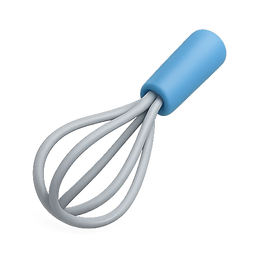 A simple, modern illustration of a kitchen whisk featuring a blue handle and gray whisking wires, ideal for culinary-themed graphics or product design.