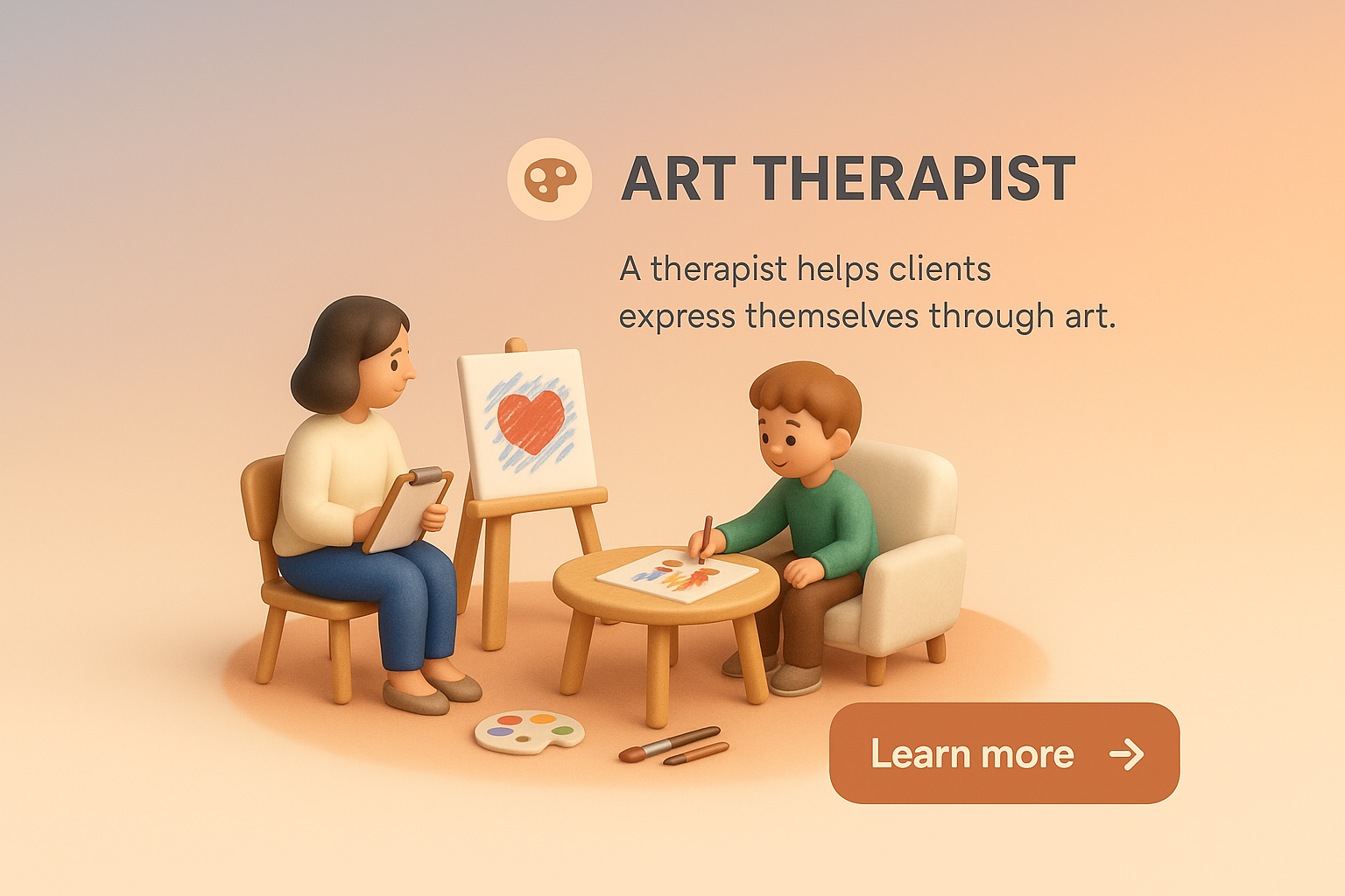 /Collection: /by davooda/Type: PNG/A 3D scene depicting an art therapist guiding a child in a creative session. The background features a smooth gradient, enhancing the calm atmosphere. The design includes visual elements like art supplies and expressive artwork.