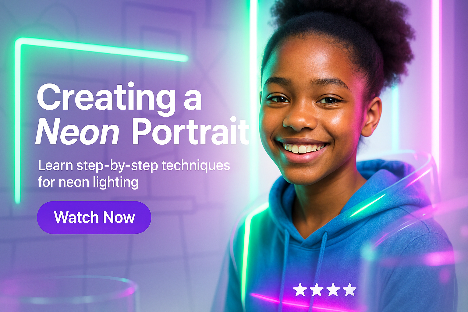 Vibrant promotional graphic for a tutorial on creating neon portraits, featuring a smiling subject illuminated by colorful neon lights. Ideal for online learning platforms.