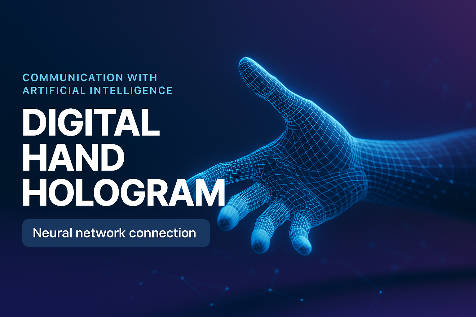 A striking digital hand hologram set against a dark gradient background. The design highlights neural network connections, embodying communication with artificial intelligence.