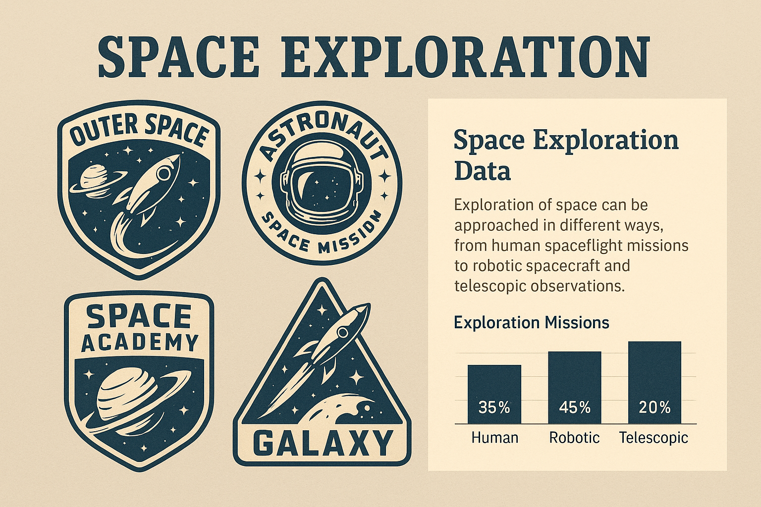 This image features a collection of badges representing various aspects of space exploration, including human and robotic missions. The design is retro and informative, suited for educational or promotional use.