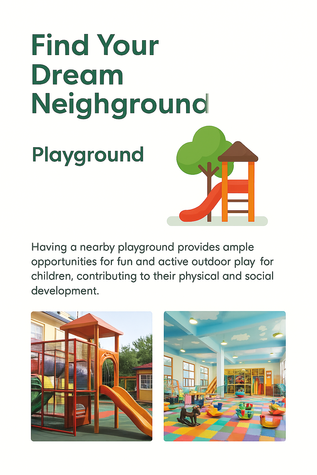 /Collection: /by davooda/Type: PNG/Informative graphic promoting the benefits of nearby playgrounds, featuring playful illustrations and a clean design, ideal for community outreach or children's programs.