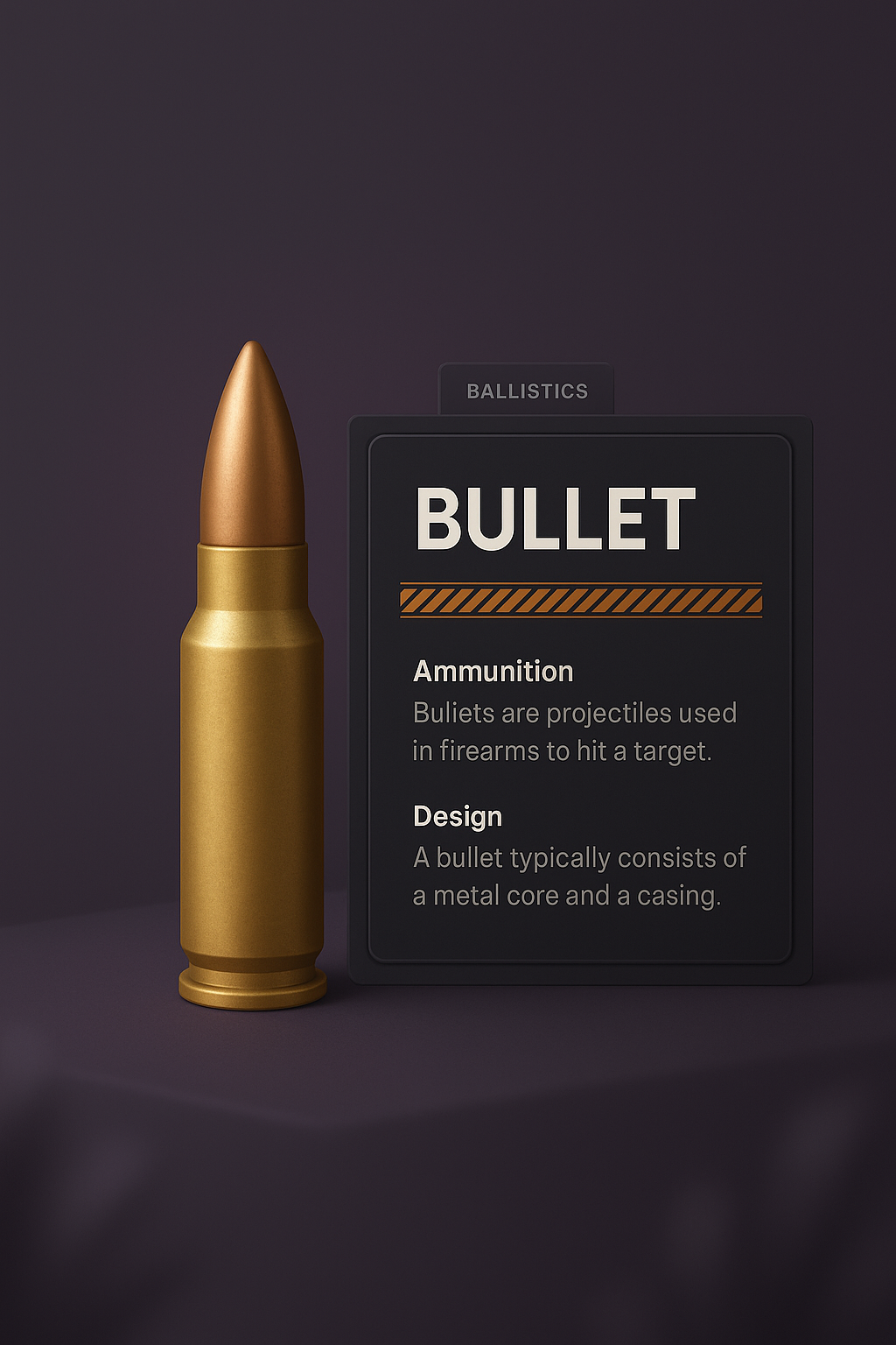A detailed 3D illustration of a bullet, accompanied by dark-themed informational blocks. The background features a smooth gradient, enhancing the visual appeal.