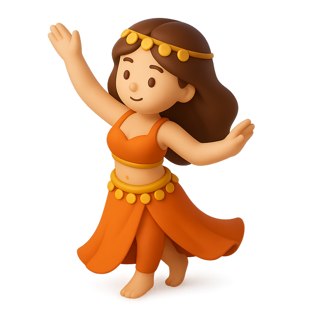 A vibrant 3D icon of a belly dancer, featuring a playful pose with flowing orange attire. The design has a transparent background, showcasing a volumetric and isometric style.