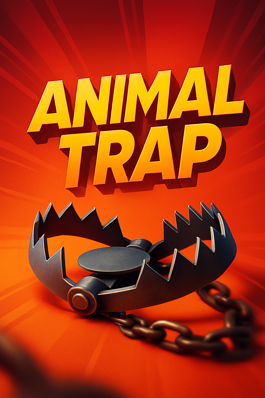 A striking 3D illustration of an animal trap set against a vibrant background. The trap features sharp edges and a chain, creating a sense of dynamic action.