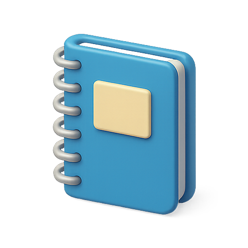 A vibrant 3D icon representing a spiral-bound notebook. The design features a blue cover with a yellow label, making it suitable for digital applications and educational content.