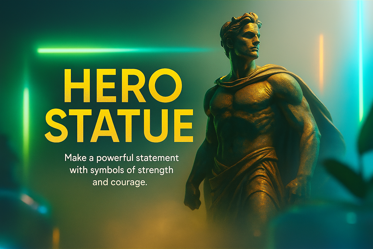 /Collection: /by davooda/Type: PNG/A striking hero statue illuminated by neon accents in deep greens and warm golds. The design features a strong figure embodying strength and courage, with layered text and glowing elements for a dynamic look.