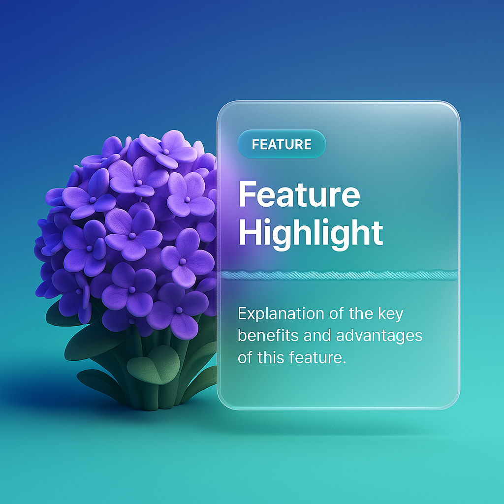 A lush bush of purple flowers sits against a smooth gradient background. A transparent feature highlight box overlays the flowers, detailing key benefits.