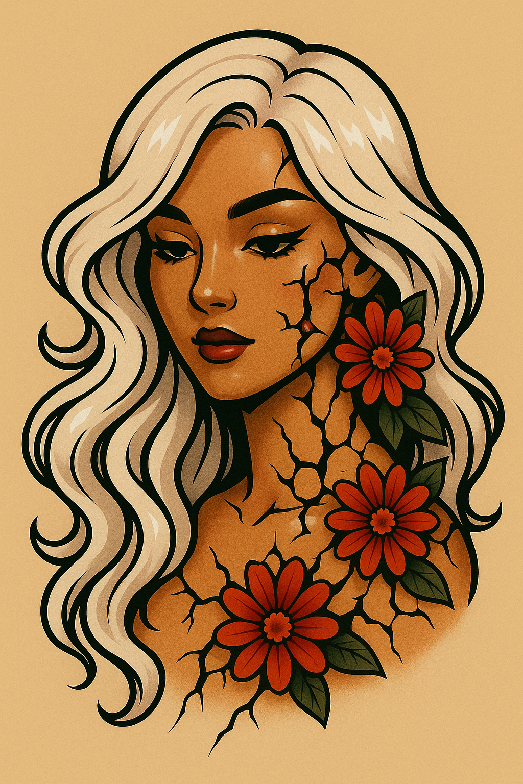 /Collection: /by davooda/Type: PNG/This image features a girl with striking white hair, her skin adorned with a floral tattoo design. The background is a soft beige, enhancing the glossy, anime-inspired aesthetic.