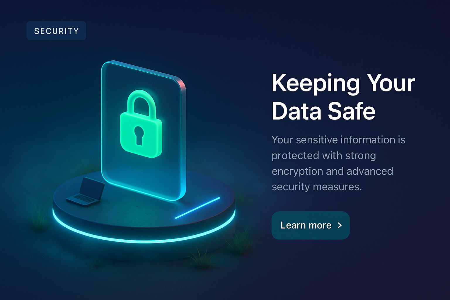 /Collection: /by davooda/Type: PNG/A zoomed-out, realistic 3D scene featuring a neon-themed data security concept. The composition includes a lock icon, text blocks, and a simple action button, all on a dark gradient background.