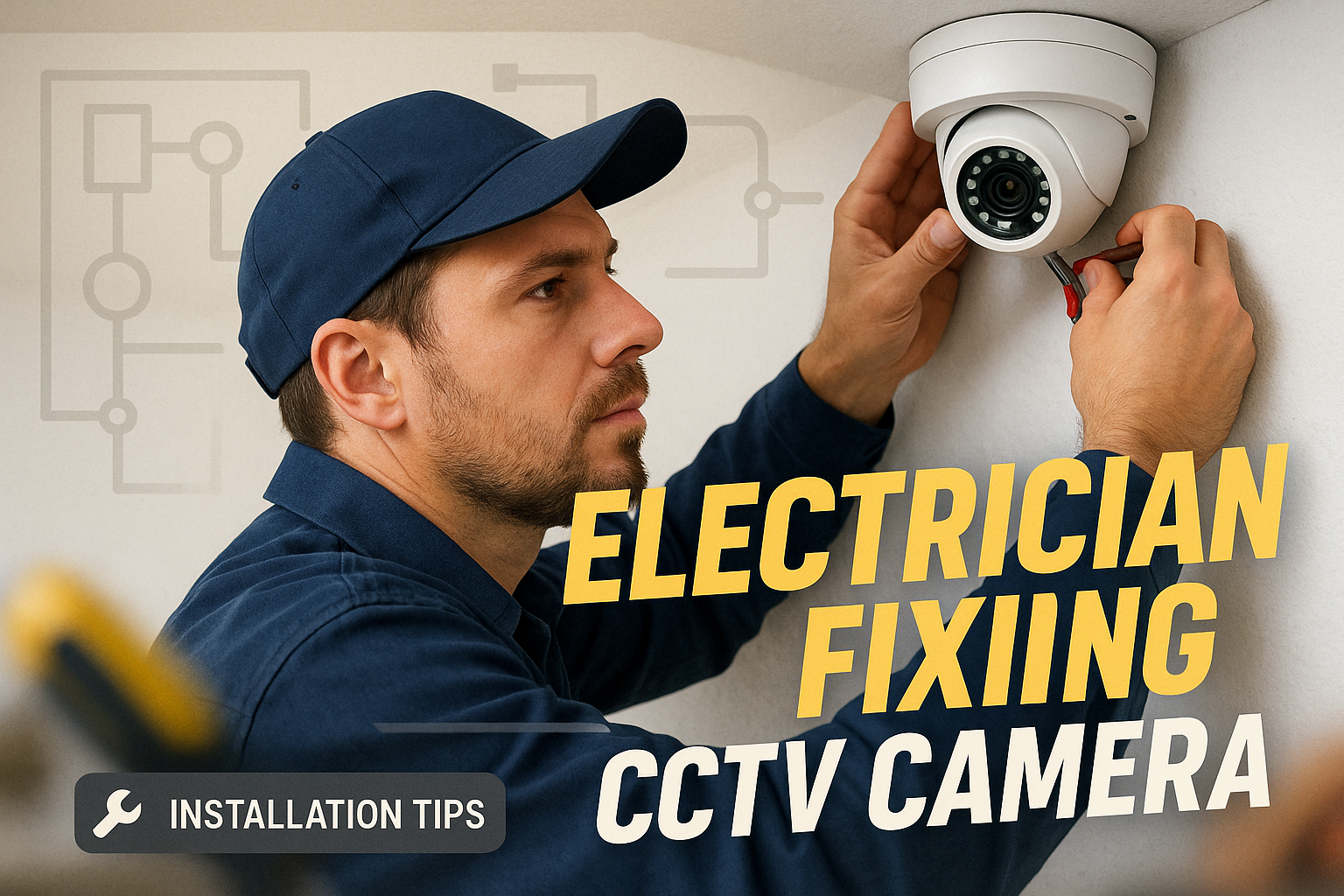 Electrician Installing CCTV Camera with Installation Tips Overlay