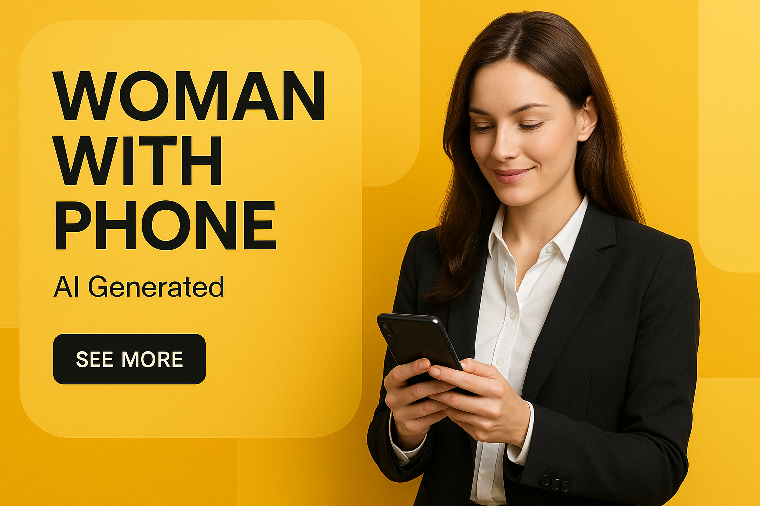 /Collection: /by davooda/Type: PNG/A modern corporate design showcasing a woman using a phone against a bright yellow background. The composition includes bold typography and a clear layout.