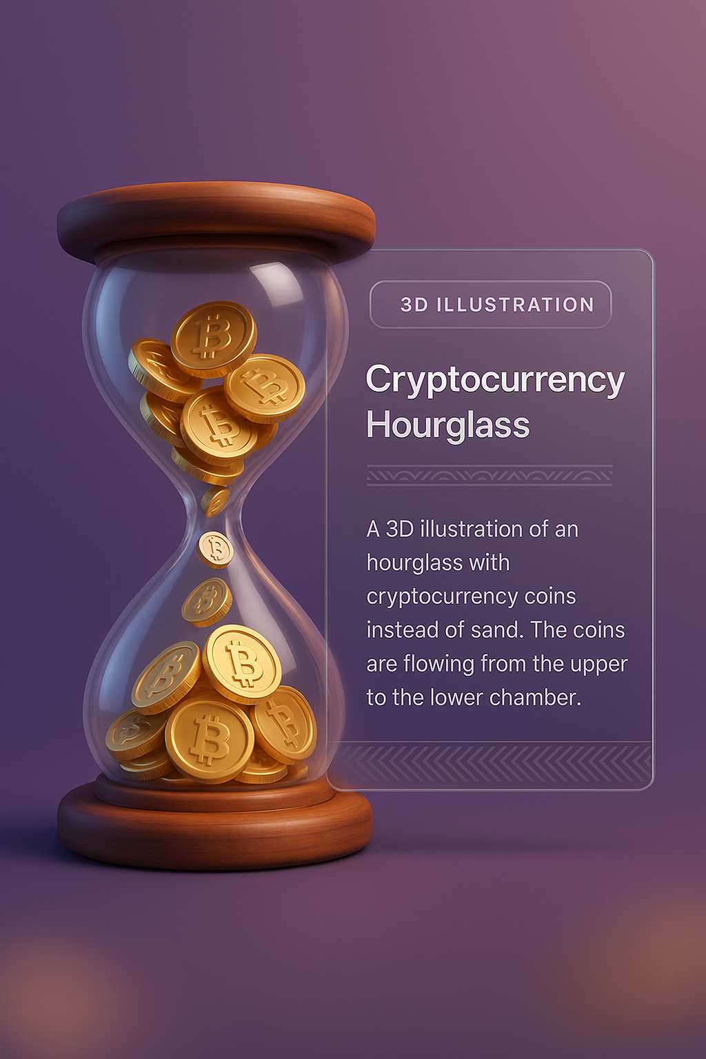 /Collection: /by davooda/Type: PNG/A 3D illustration depicts an hourglass filled with cryptocurrency coins instead of sand. The design features a smooth gradient background and a modern, sleek aesthetic.