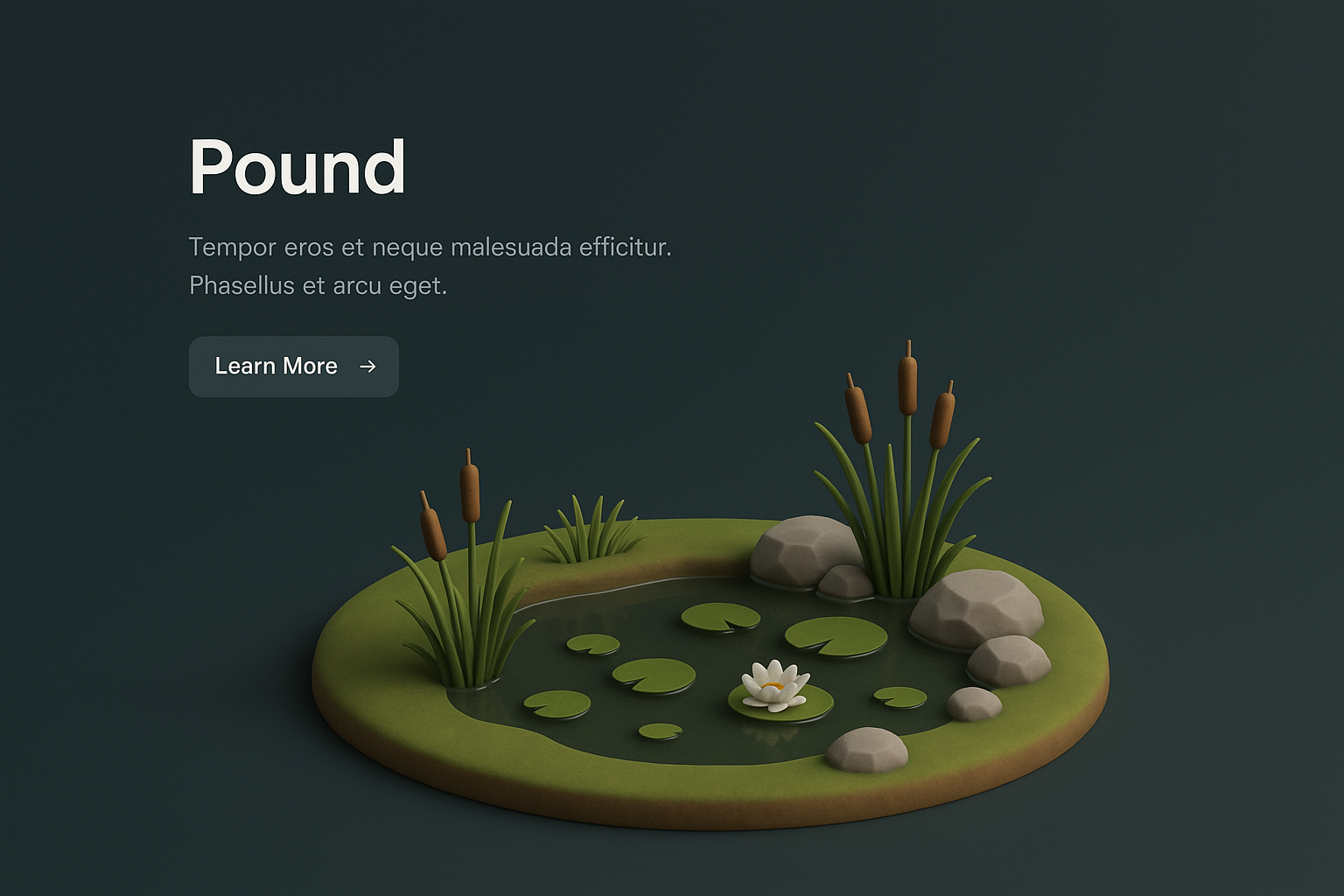 /Collection: /by davooda/Type: PNG/A serene 3D scene depicting a small pond surrounded by cattails and rocks. The dark gradient background enhances the vibrant colors of the landscape, creating a realistic view.