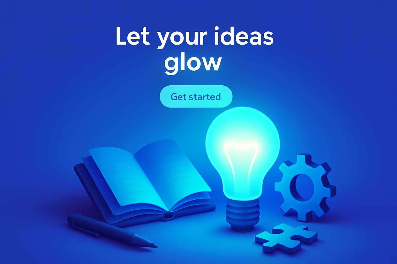 /Collection: /by davooda/Type: PNG/An abstract illustration featuring a glowing light bulb, an open book, a gear, and a pen, all bathed in neon aquamarine and blue hues, creating a serene atmosphere.