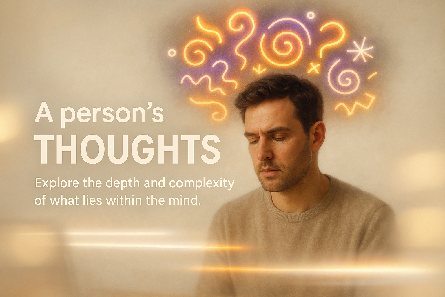 /Collection: /by davooda/Type: PNG/A conceptual graphic illustrating the complexity of human thoughts with a serene figure and abstract designs representing mental activity, suitable for mental health discussions.